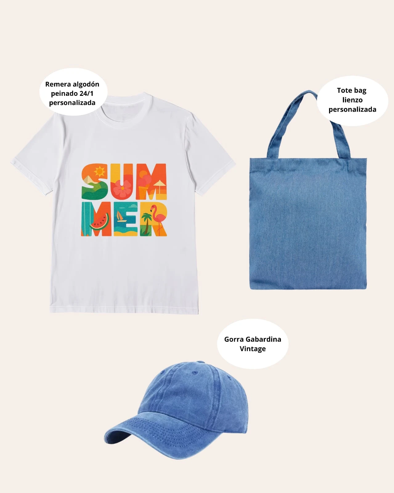 Remera algodón peindo 24/1 + Tote bag de lienzo + gorra gabardina vintage. Todos personalizados